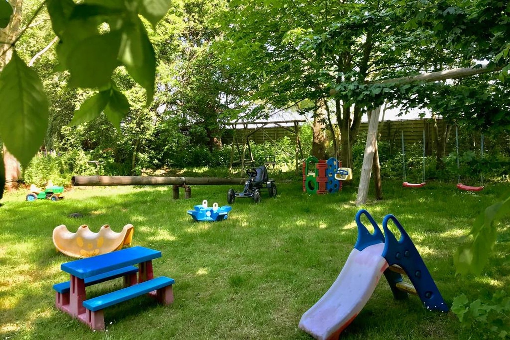 Weiter haben wir einen Spielplatz mit Rutsche, Kletterturm, Schaukel, Wippen für große und kleine Kinder, ein kleines Fußballtor, Tischtennisplatte und viele weitere Spielsachen.
